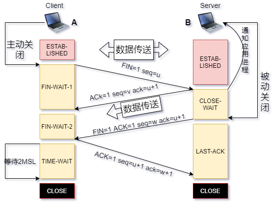 数据传输结束后,通信的双方都可以释放连接。现在A和B都处于ESTABLISHED状态。