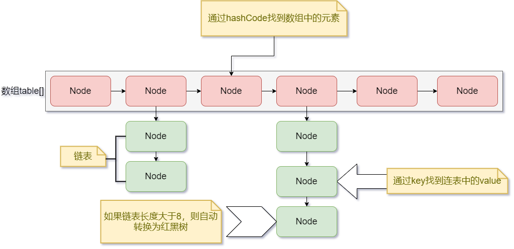 - 如果是链表,则遍历链表将Node放到最后一位(尾插法)。放完以后需要去判断链表的长度是否超过8,大于8时尝试将链表转换为红黑树(数组长度需要大于64);