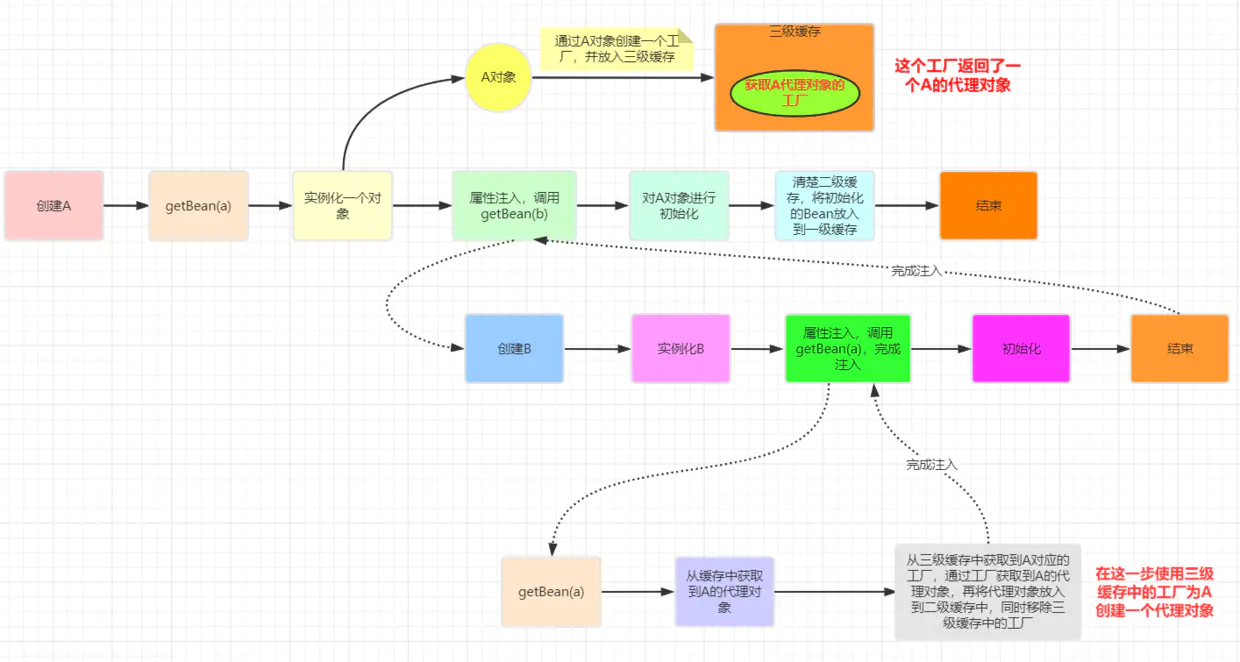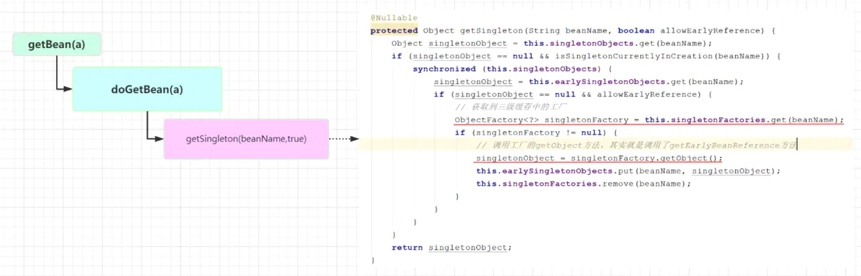 因为B需要注入A,所以在创建B的时候,又会去调用getBean(a),这个时候就又回到之前的流程了,但是不同的是,之前的getBean是为了创建Bean,而此时再调用getBean不是为了创建了,而是要从缓存中获取**,因为之前A在实例化后已经将其放入了三级缓存singletonFactories中**,所以此时getBean(a)的流程就是这样子了